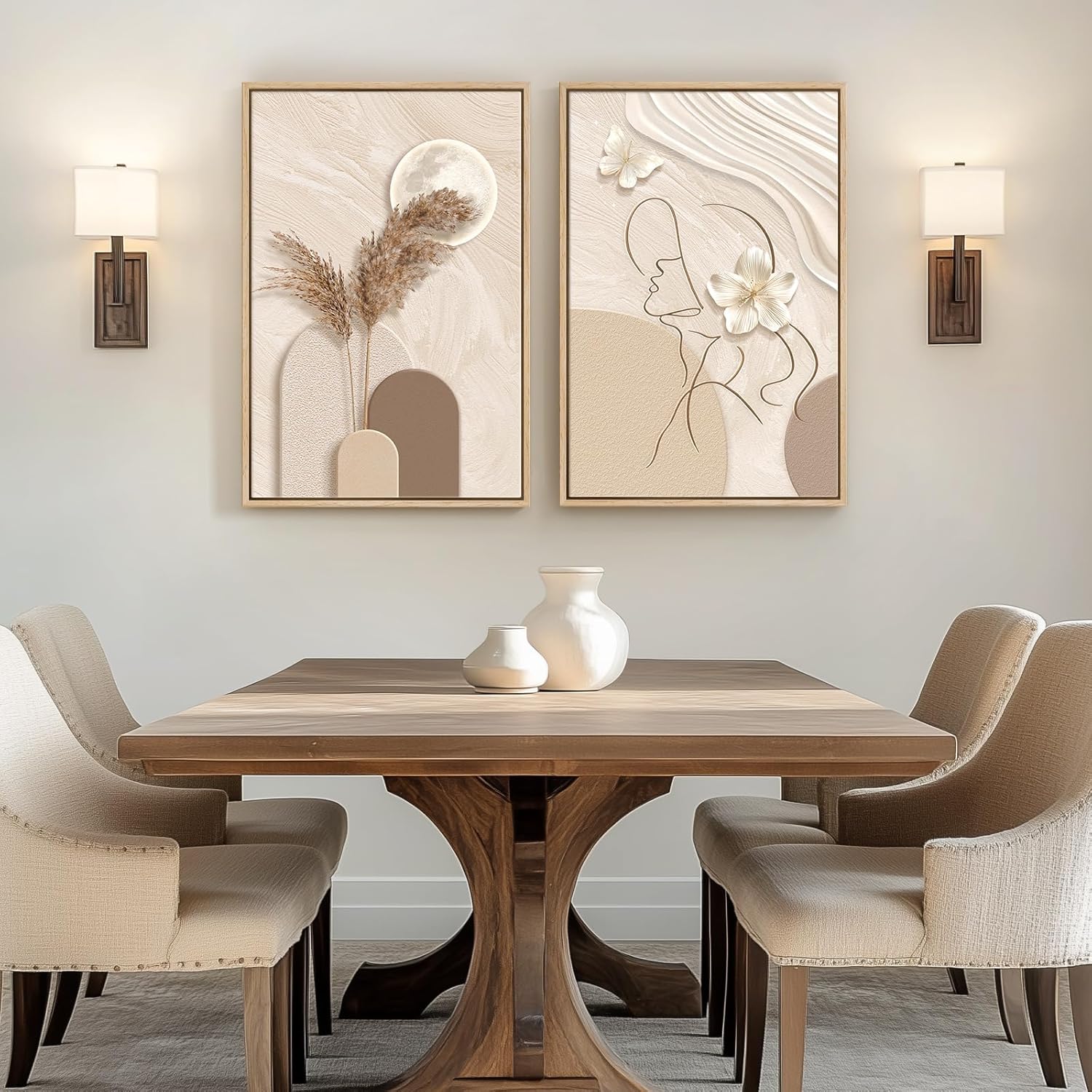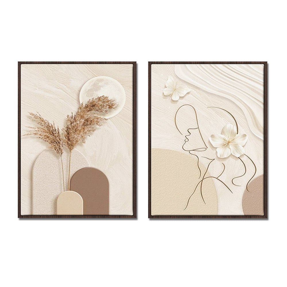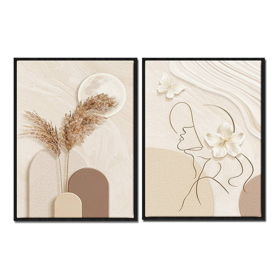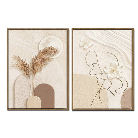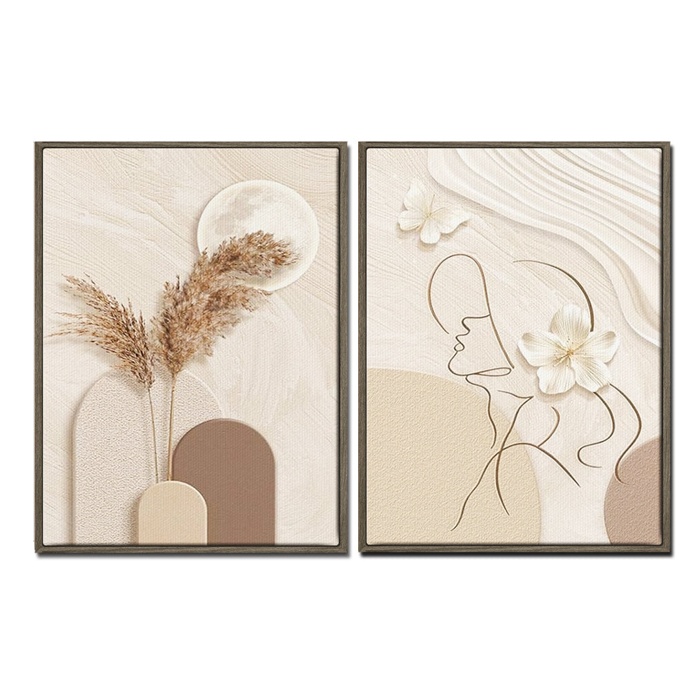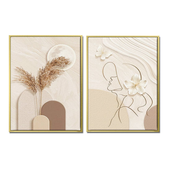 The 2 pieces paintings mainly use beige, light tan and cream, and the overall neutral tone is very soft, giving people a feeling of peace and harmony. In the painting on the left, the combination of the moon and dried flowers creates a natural and mysterious atmosphere, and in the painting on the right, the simple lines of the human outline and the design of flowers have a kind of abstract art aesthetic. Very suitable for decorating the living room, bedroom, dining room, study or bathroom and other scenes, can create a warm and comfortable atmosphere