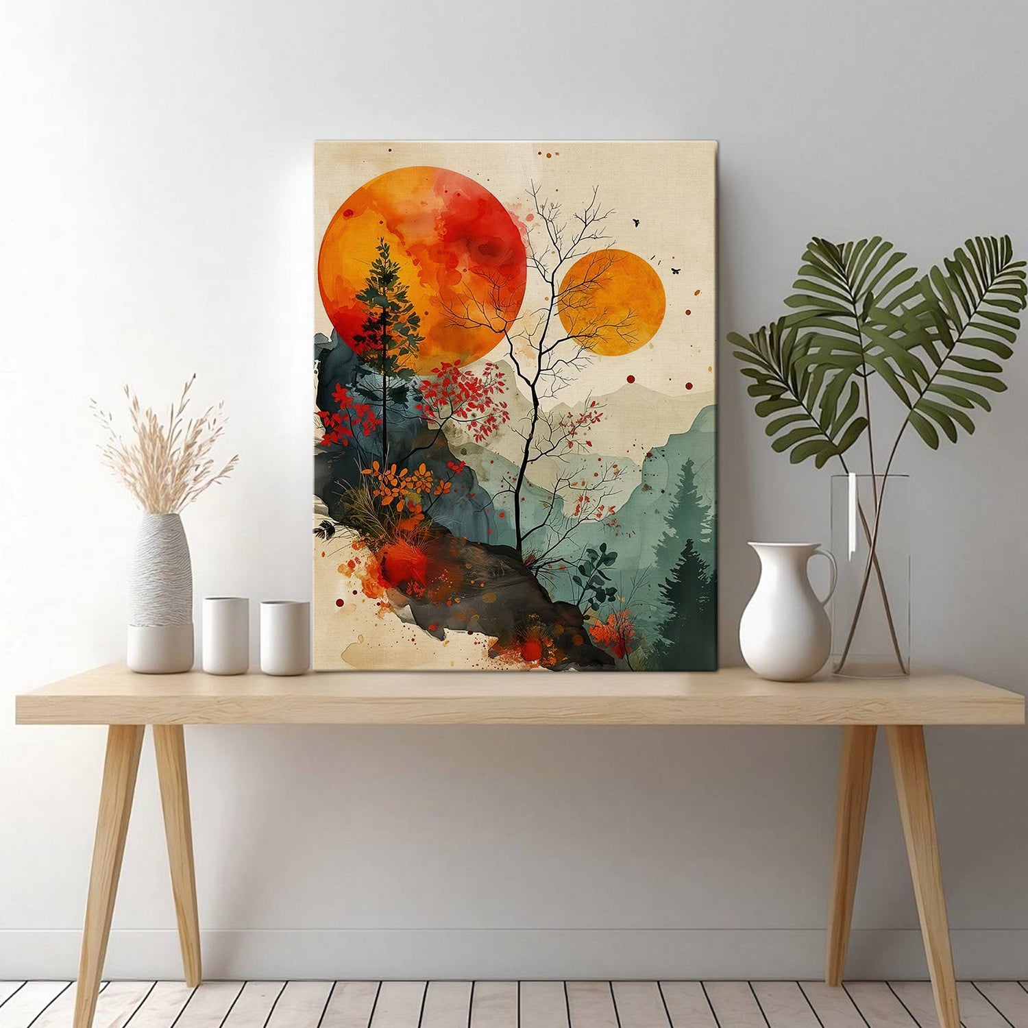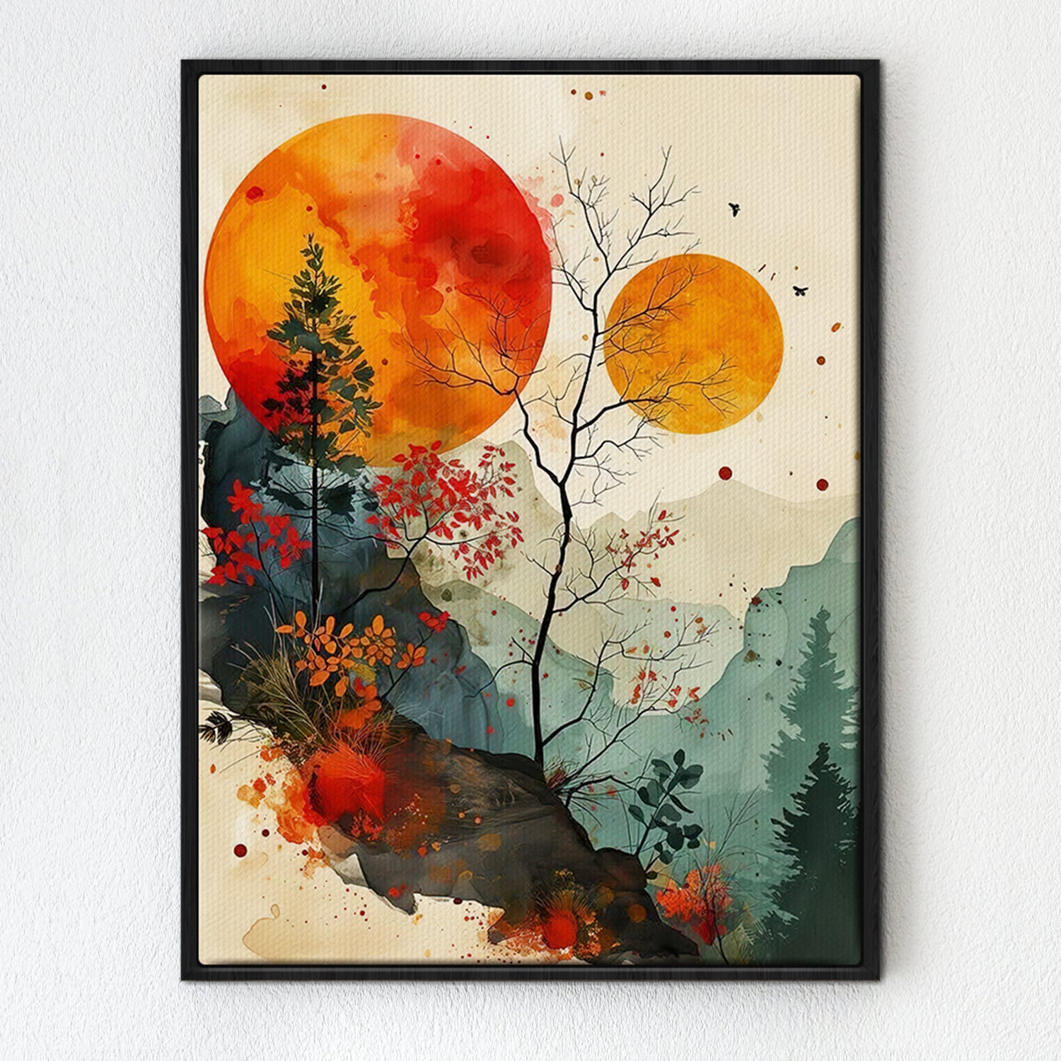 This wall art painting depicts an abstract autumn landscape, with the sun and moon both high in the sky, and crimson flowers and withered trees complementing the mountains. Its simple, rich colors, and bold style make it a striking piece of art, perfect for your home.